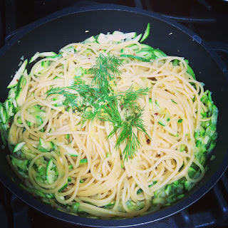 以前Elle Maman でも紹介したズッキーニのパスタ。細く切ったズッキーニの水分を抜いてから、ニンニクと唐辛子で炒めます。今回はディルとレモンも最後に入れてさっぱりと。今一番好きなパスタです。